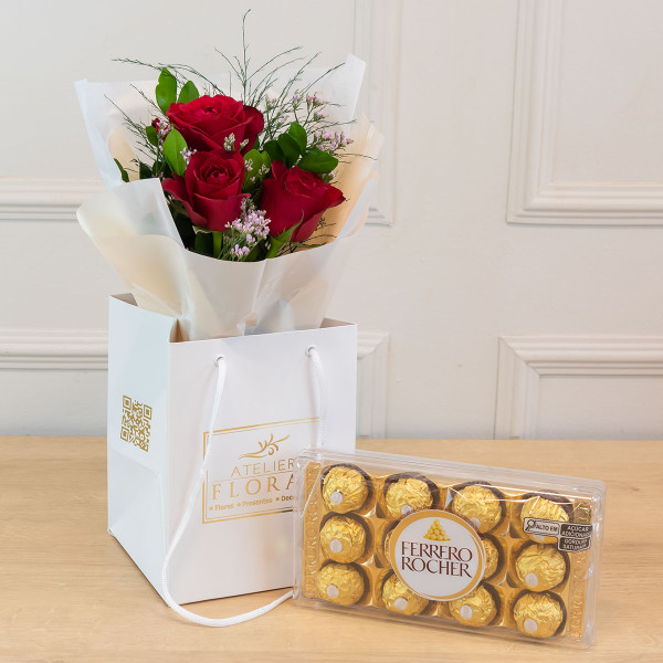 Um presente elegante e apaixonante. Este buquê delicado de rosas vermelhas vem acompanhado de uma sofisticada caixa de bombons Ferrero Rocher — combinação perfeita para surpreender quem você ama com romantismo e sabor. Ideal para ocasiões especiais como Dia dos Namorados, aniversários ou simplesmente para dizer "você é especial".