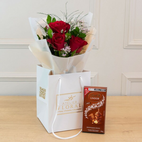 Uma união perfeita entre romantismo e sabor! Este presente reúne um delicado buquê com rosas vermelhas selecionadas, embalado com todo o cuidado na sacola exclusiva do Atelier Floral, acompanhado da deliciosa barra de chocolate Lindor Lindt Avelã (100g). Ideal para declarar sentimentos com elegância — seja no Dia dos Namorados, aniversários ou qualquer momento especial.