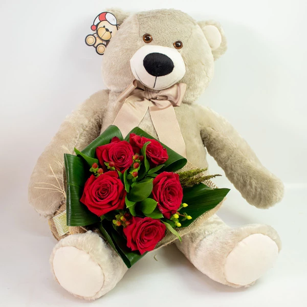 Composto por um delicado buquê Ella feito com 5 rosas importadas, folhagens, complementos e uma surpreendende pelúcia.