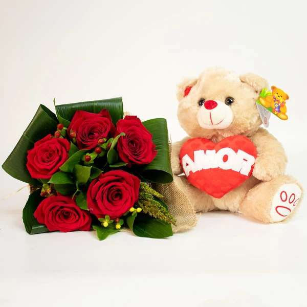 O buquê Ella é um lindo buquê composto por 5 rosas importadas mais folhagens e complementos embalado na tela de juta natural com laço de ráfia, esse buquê acompanha um dlindo urso de pelúcia com coração.