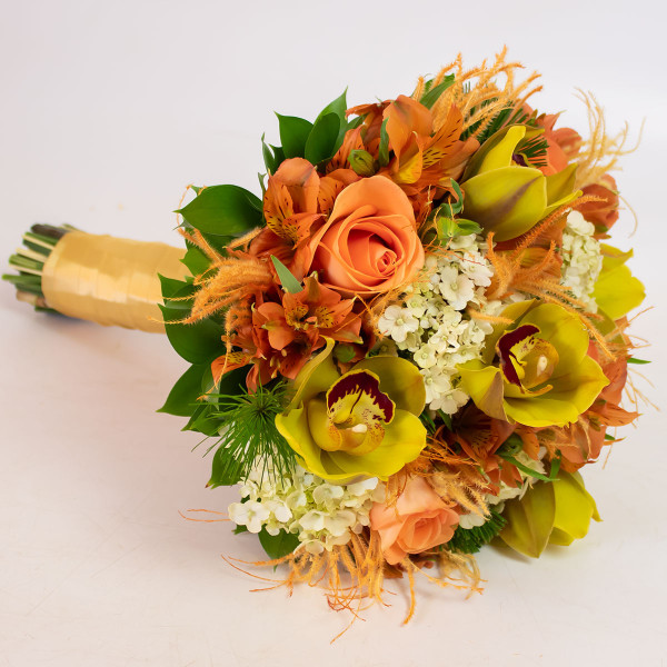 Buquê noiva composto por orquídea cymbidium, rosas, alstroemérias, hortências e folhagens. O Buquê Grace é um clássico buquê redondo em tons de laranja.