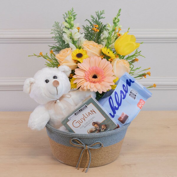 Encante com um presente completo e inesquecível. A Cesta Carinho com Flores Mistas, Pelúcia e Chocolates Finos é perfeita para surpreender em datas especiais como aniversário, Dia das Mães, Dia dos Namorados ou para demonstrar carinho em qualquer ocasião. A composição inclui um arranjo com flores frescas em tons pastel, um urso de pelúcia branco macio e dois chocolates importados: Guylian Belgian Chocolates e Mini Waffles Bahlsen ao Leite.