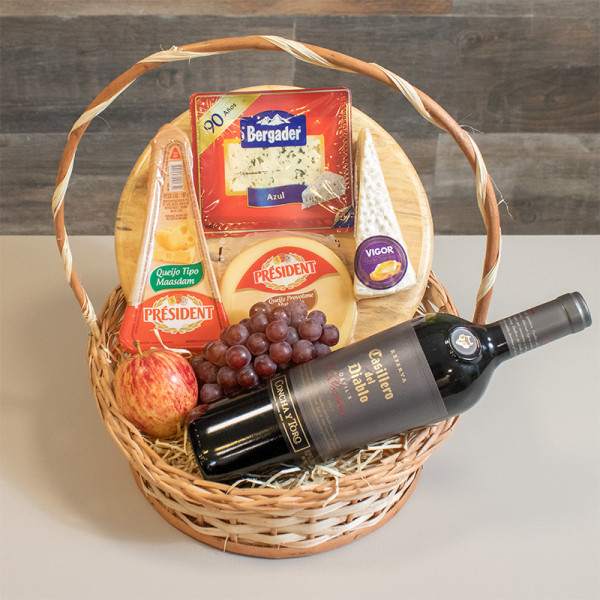 Itens: Tábua de madeira, 4 tipos de queijos, 2 tipos de frutas e um vinho tinho 750ml.