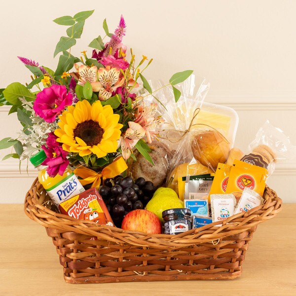 Cesta de café da manhã com um arranjinho de flores variadas.