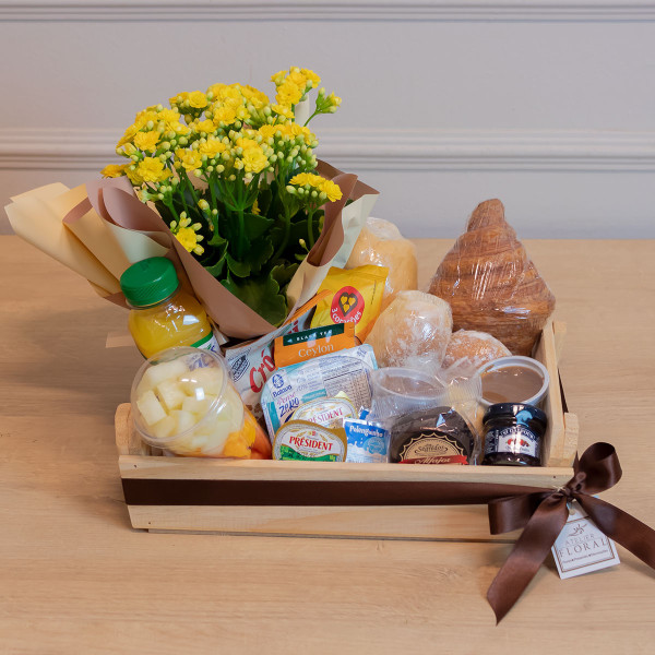 A Cesta de Café da Manhã Aurora foi criada para transformar o início do dia em um momento especial. Uma composição elegante que reúne delícias de padaria, frutas frescas, bebidas selecionadas e um delicado vaso de planta natural, cuidadosamente organizada em uma charmosa bandeja de madeira.