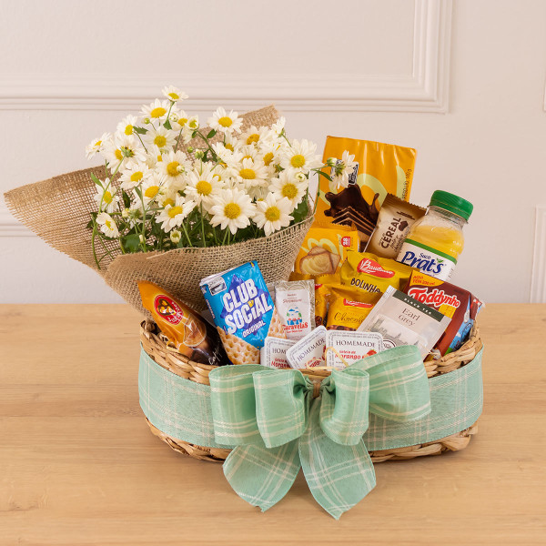 Contém: suco, achocolatado, torrada, bolinho, club social, bolachas doces e salgadas, cappuccino, chá, açúcar, geleia, barra de cereal, biscoito Waffer e um vasinho de mini crisântemo na juta