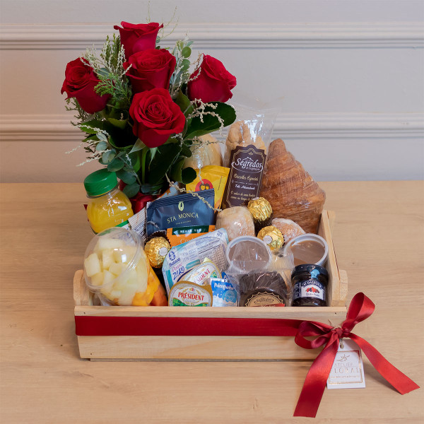 A Cesta de Café da Manhã Romance foi criada para surpreender e emocionar logo nas primeiras horas do dia. Uma composição elegante que reúne delícias de padaria, frutas frescas, bebidas e um delicado arranjo com rosas vermelhas, símbolo clássico de amor e carinho.