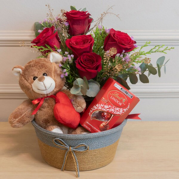 Romântica, delicada e repleta de significado. A Cesta Moulin é composta por um arranjo encantador de rosas vermelhas importadas, acompanhadas por um ursinho de pelúcia carinhoso e uma caixa de bombons Lindt Lindor ao leite (75g), com recheio cremoso e envolvente. A montagem é feita em uma charmosa cesta de corda, criando um presente perfeito para surpreender em aniversários, datas românticas ou para simplesmente declarar amor com elegância.
