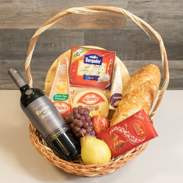 Itens: Tábua de madeira, 4 tipos de queijos, 3 tipos de frutas, um pão italiano, um chocolate suiço Lindt Lindor ao leite e um vinho tinto de 750ml.