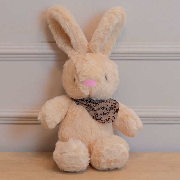 A nossa Pelúcia Coelho 0356 foge do tradicional, trazendo um visual contemporâneo que encanta tanto crianças quanto adultos. Com uma pelagem extremamente fofa em tom creme e um nariz rosa delicado, este coelhinho ganha destaque pelo seu acessório: uma bandana (lenço) com estampas de grafismos e letras, conferindo um toque moderno ao design.