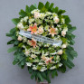 Coroa de condolências, composta flores disponíveis na época, como shena, lírios, orquídeas, rosas, girassóis, alstroemérias e folhagens.
