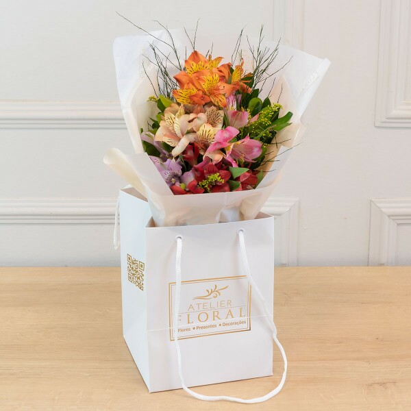 O Mini Buquê de Alstroemérias Coloridas (25cm) combina a delicadeza e o charme das alstroemérias em tons vibrantes, acompanhadas de folhagens selecionadas. Embalado em uma sacola exclusiva do Atelier Floral, esse arranjo é perfeito para presentear em aniversários, agradecimentos ou simplesmente para surpreender alguém especial com um toque de cor e sofisticação.