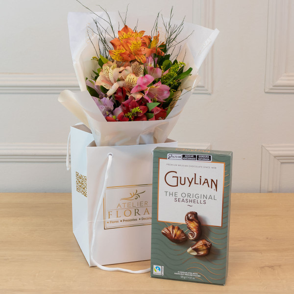 Um presente sofisticado para encantar em qualquer ocasião. O Mini Buquê de Alstroemérias Coloridas (25cm) combina a delicadeza das alstroemérias em tons vibrantes com folhagens naturais, embaladas em uma sacola exclusiva do Atelier Floral. Para tornar o momento ainda mais especial, acompanha uma caixa de chocolates Guylian Seashells (125g), famosos pelos bombons belgas em formato de concha, feitos com chocolate ao leite e recheio de avelã.