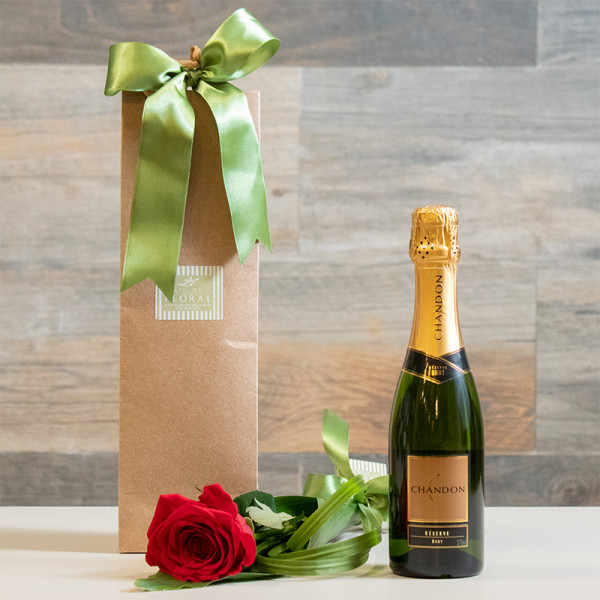 Uma rosa colombiana vermelha embalada na folha de haran e detalhe com folhas de moréia e laço de cetim acompanhado por um espumante Chandon brut de 375ml e enviado numa chamosa sacolinha kraft.