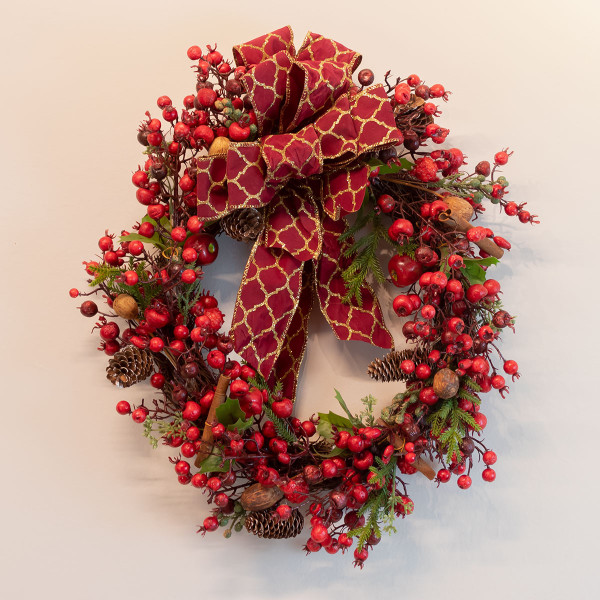 Enfeites com berries, pinhas e folhagens