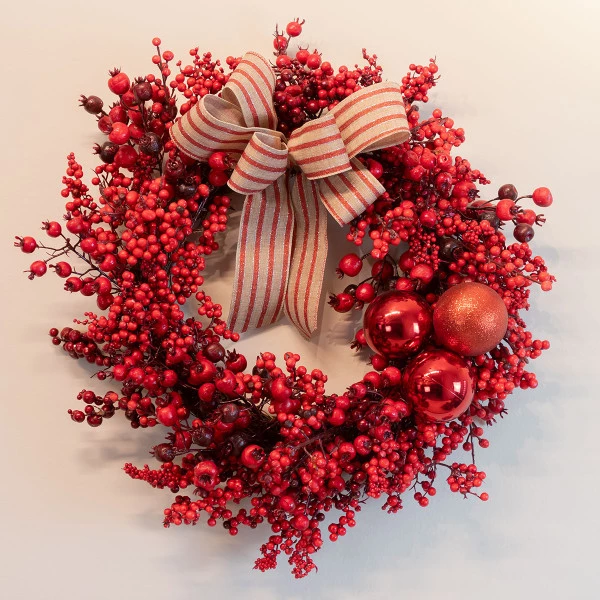Enfeitada com bolas natalinas e berries em tons vermelhos