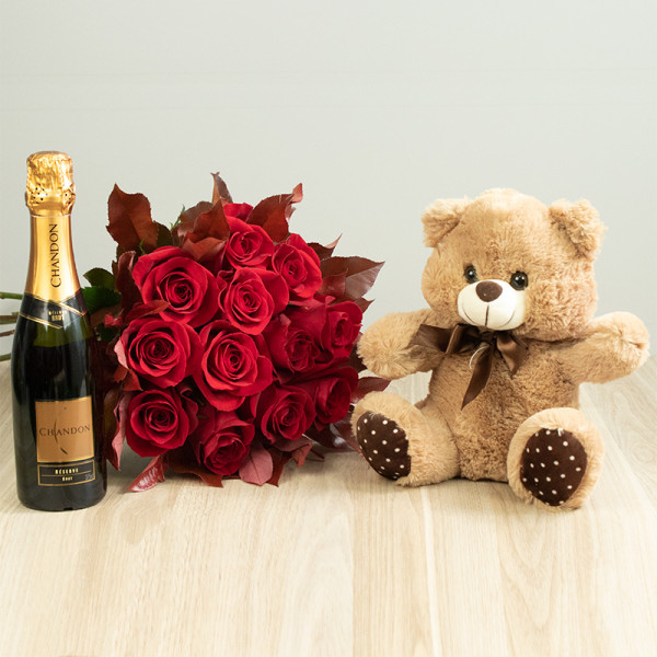 Quer surpreender e deixar o seu presente ainda mais completo? presenteie com esse kit composto por um espumante Chandon Brut de 375ml, um urso de pelúcia e um lindo buquê de 12 rosas importadas envolto por folhagens da estação.