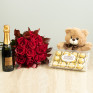 Quer surpreender e deixar o seu presente ainda mais completo? presenteie com esse kit composto por uma caixa com 12 deliciosos bombons Ferrero Rocher, um espumante Chandon Brut de 375ml, um urso de pelúcia e um lindo buquê de 12 rosas importadas envolto por folhagens da estação.