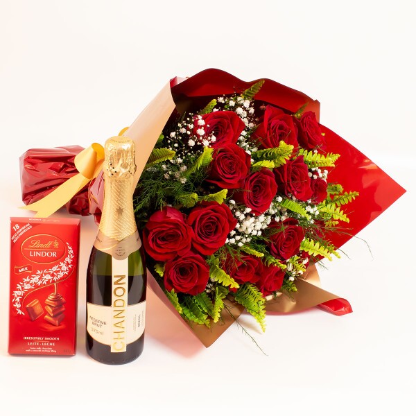 Lindo buquê composto por rosas 18 rosas importadas com folhagens, um delicioso tablete de chocolate Lindt Lindor Milk 100g e uma Chandon Brut 375 ml.