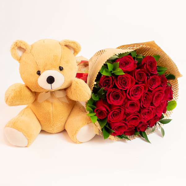 Quer surpreender e deixar o seu presente ainda mais completo? presenteie com esse kit composto por um fofíssimo urso de pelúcia com um lindo buquê de 24 rosas importadas envolto por folhagens da estação.