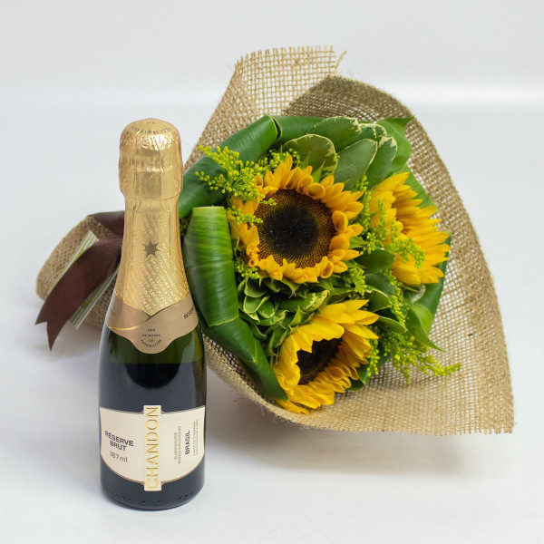 Surpreenda com um presente que combina a beleza das flores com o sabor da celebração! Este kit especial inclui um buquê delicado com 3 girassóis, embalado em uma charmosa tela de juta, e um espumante Chandon Baby Brut (187ml) para brindar momentos inesquecíveis.