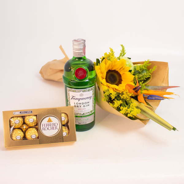 Lindo kit composto por um buquê delicado tropical com Girassol, Strelitzia e complementos, acompanhado por uma caixa com 8 bombons Ferrero Rocher e um Gin Tanqueray 750ml.