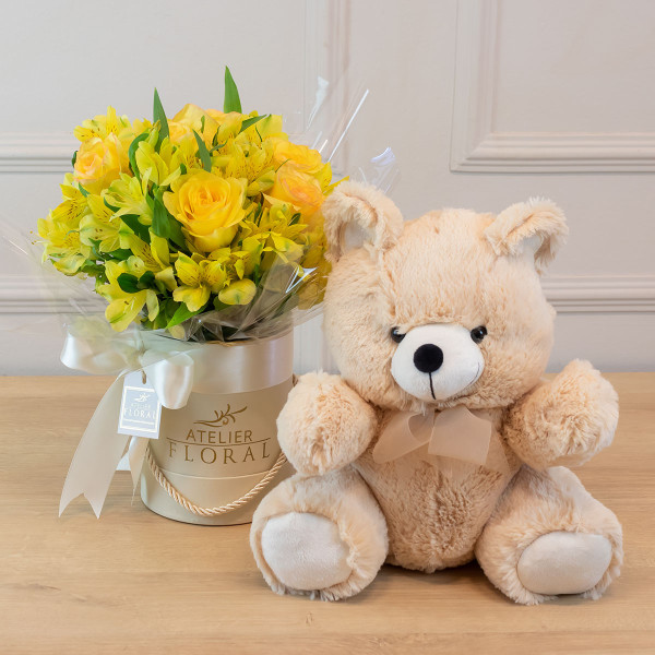 Surpreenda com o Kit Presente com Arranjo de Flores Amarelas e Urso de Pelúcia - Grenoble, uma combinação encantadora que transmite carinho e delicadeza. O arranjo floral é composto por rosas e alstroemerias amarelas, simbolizando alegria e boas energias, disposto em uma caixa personalizada com laço de cetim.