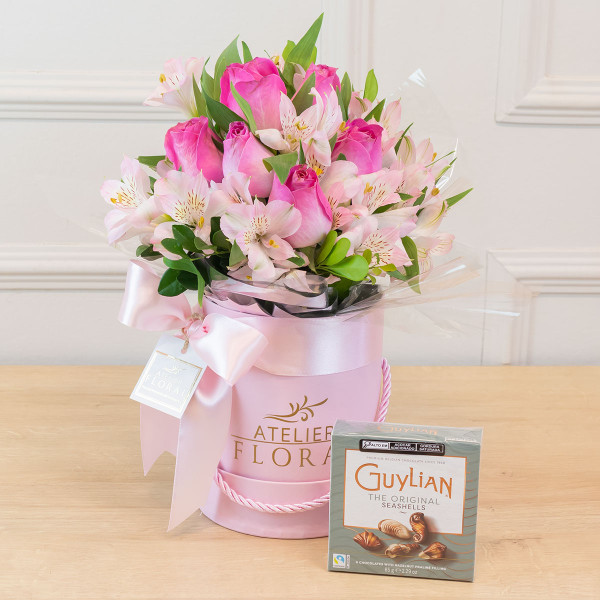 O Kit Presente com Arranjo de Flores Rosadas e Bombons Guylian - Grenoble é um presente sofisticado e delicado, ideal para surpreender em momentos especiais. Esse kit exclusivo combina:
