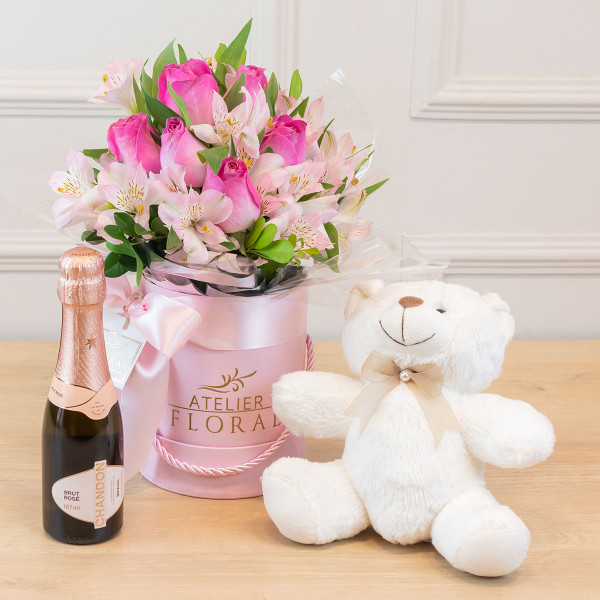 O Kit Presente com Arranjo de Flores Rosadas, Urso de Pelúcia e Espumante Chandon Rosé - Grenoble é a escolha perfeita para celebrar momentos especiais com sofisticação e carinho. Esse kit exclusivo combina:
