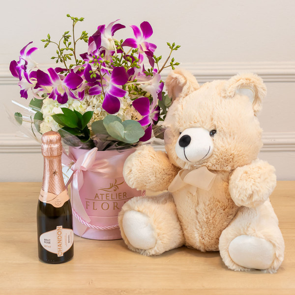 O Kit Presente com Arranjo de Orquídeas Denphal, Urso de Pelúcia e Espumante Chandon - Lyon é um presente sofisticado e encantador, perfeito para celebrar momentos especiais com elegância e carinho.