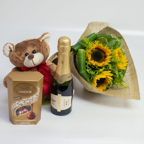 Surpreenda alguém especial com este kit encantador que combina flores, doçura e celebração! O presente inclui um buquê delicado com 3 girassóis, um urso de pelúcia fofo com coração, uma caixa de bombons Lindt Lindor sortidos (75g) e um elegante espumante Chandon Baby Brut (187ml).