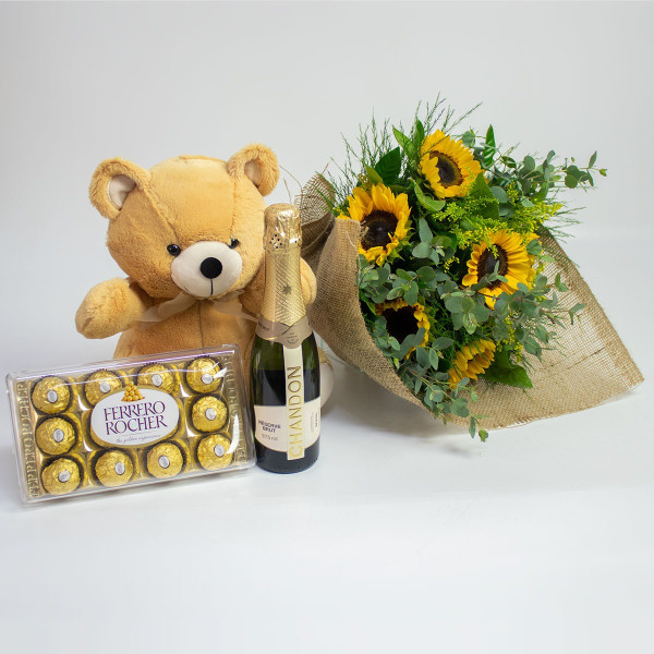 E para tornar o momento ainda mais especial, o kit vem com um sofisticado espumante Chandon Brut (375ml) e uma deliciosa caixa com 12 bombons Ferrero Rocher, combinando sabores irresistíveis com o brilho do girassol.