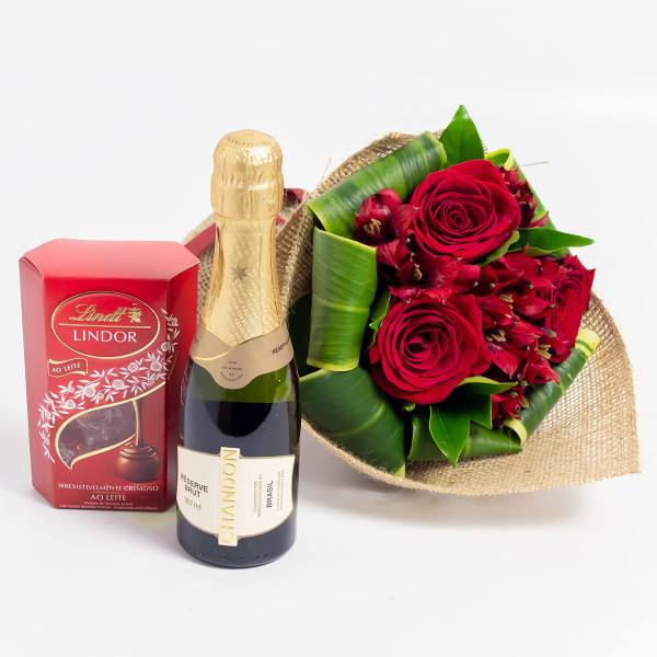 Buquezinho de 3 rosas importadas em meio a folhagens e envolto por tela de juta sintética, uim espumante Chandon baby brut de 187ml e chocolate Lindt Lindor Milk 75g. Ideal para presentear alguém especial!