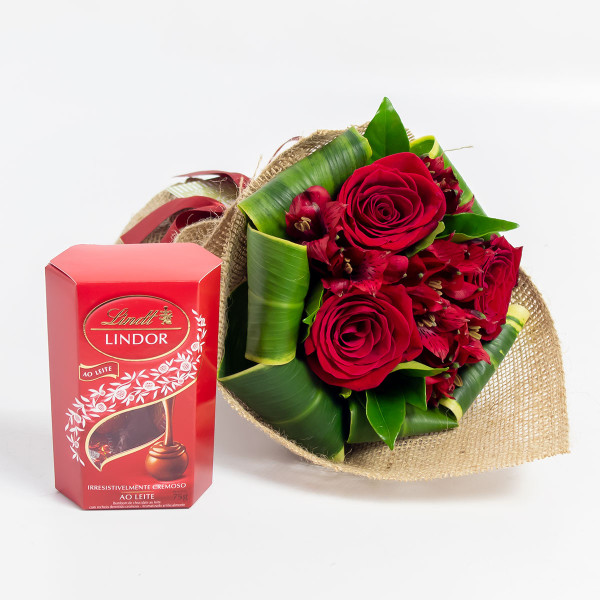 Buquezinho de 3 rosas importadas em meio a folhagens e envolto por tela de juta sintética e chocolate Lindt Lindor Milk 75g. Ideal para presentear alguém especial!