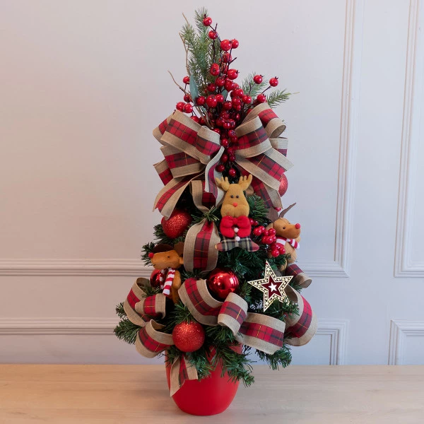 Mini Árvore de Natal Decorada em Xadrez Vermelho com Estrelas, Berries e Rena - 79 cm