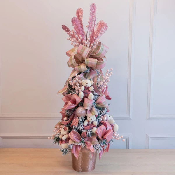 Encante sua decoração natalina com a Mini Árvore de Natal Nevada Rosa com Ursinhos Decorativos 70cm, uma peça encantadora que une delicadeza e sofisticação. Montada sobre um vaso metálico rosé, ela traz ramos nevados, fitas em tecido xadrez rosa e dourado, flores com glitter e adoráveis ursinhos de pelúcia entre os enfeites.