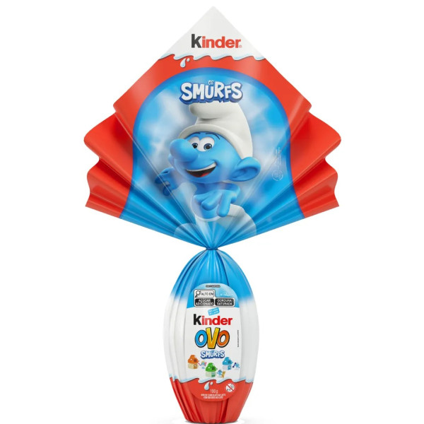 Ovo de Páscoa Smurfs, da marca Kinder, em embalagem com 100 gramas. Produto sazonal que combina chocolate ao leite com surpresa interna temática, voltado especialmente ao público infantil e ao período de Páscoa.