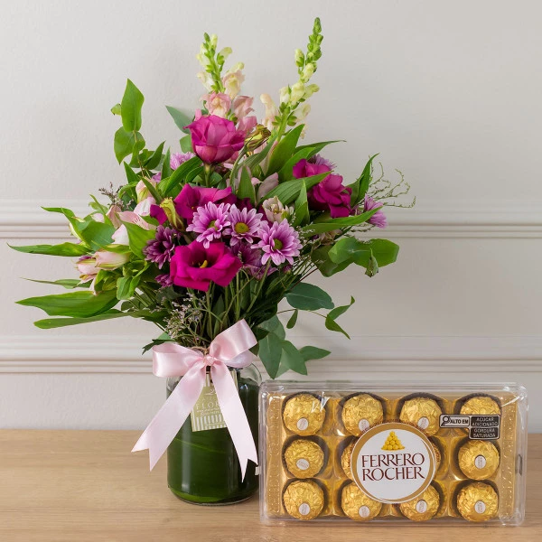 Poema é um arranjo de mix de flores perfeito para presentear com amor, carinho e admiração. Composto por 5 a 6 hastes de flores mistas variadas em tons rosado acompanhado por uma caixa com 12 bombons Ferrero Rocher.