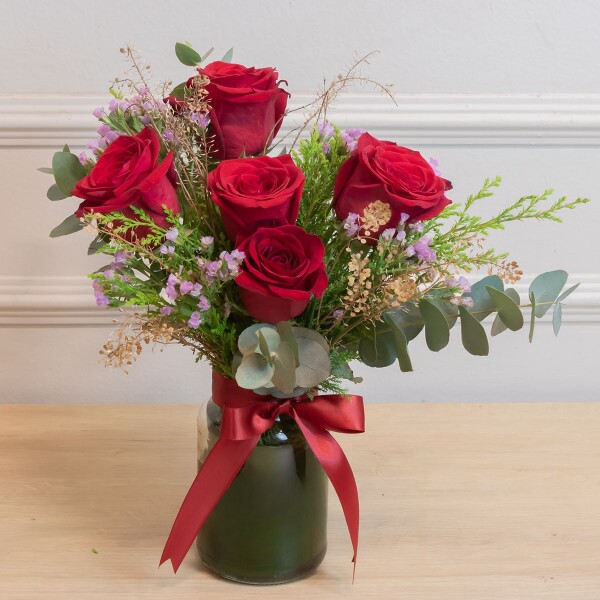 Poema é um arranjo de rosas perfeito para presentear com amor, carinho e admiração. Composto por 5 rosas importadas Vermelhas, margaridas e folhagens em um vasinho de vidro.