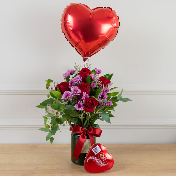 Poema é um arranjo de rosas perfeito para presentear com amor, carinho e admiração. Composto por 5 rosas Vermelhas, margaridas e folhagens em um vasinho de vidro e acompanhado por um balão em formato de coração e uma caixinha em formato de coração, com 4 bombons da celebrada linha Lindt Lindor.