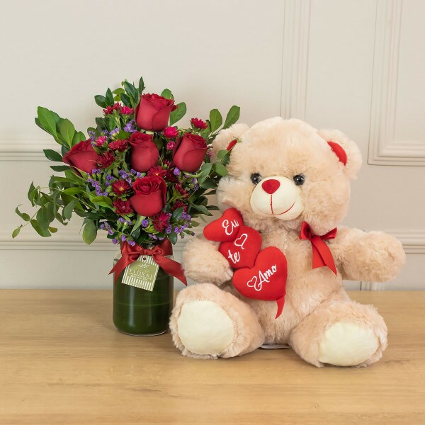 Poema é um arranjo de rosas perfeito para presentear com amor, carinho e admiração. Composto por 5 rosas Vermelhas, margaridas e folhagens em um vasinho de vidro e acompanhado por uma pelúcia.