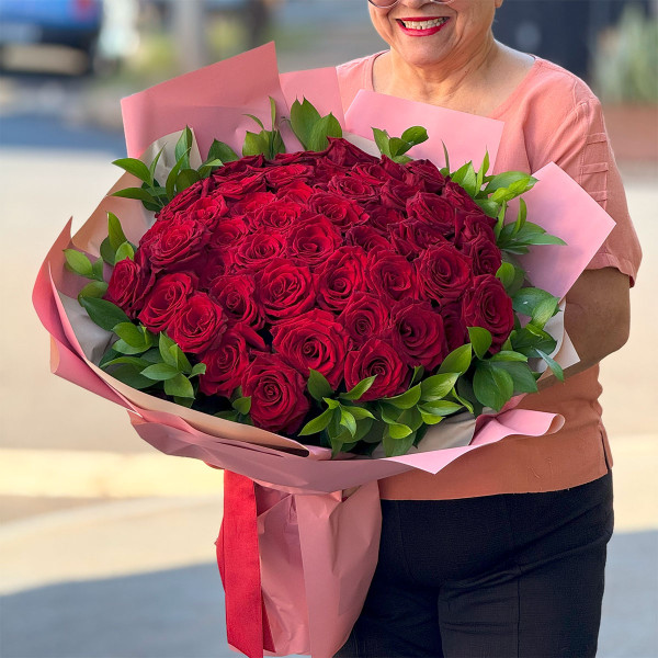 Produzido com flores importadas de alta qualidade, o ramalhete é finalizado com folhagens verdes e embalado com papel especial em tons de rosa, formando um contraste elegante e delicado. É ideal para surpreender em aniversários, comemorações de bodas, pedidos de namoro ou no Dia dos Namorados.