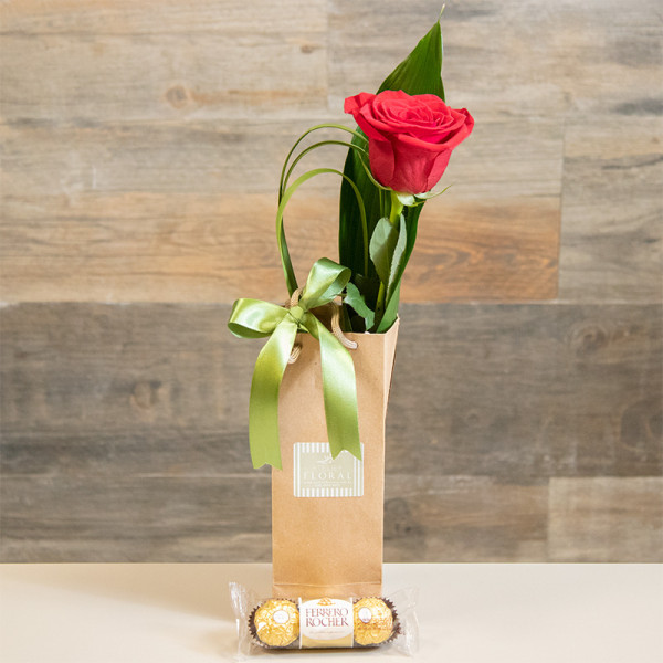 Uma rosa colombiana vermelha embalada na folha de haran e detalhe com folhas de moréia e laço de cetim acompanhado por 3 bombons Ferrero Rocher e enviado numa chamosa sacolinha kraft.