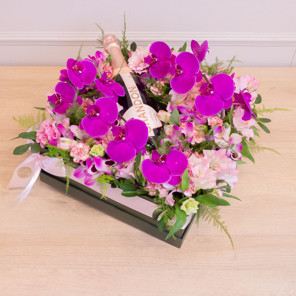 Uma box luxuosa de flores em tons de rosa complementada com uma garrafa de Chandon Rosé de 750ml, perfeita para celebrar ocasiões especiais ou surpreender alguém querido com um toque de elegância e sofisticação
