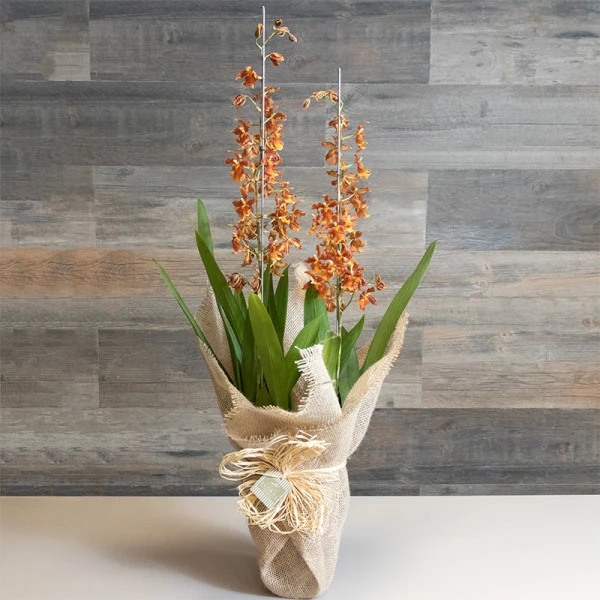 Linda e sofisticada orquídea Havaiana Catatante plantada embalada na tela de juta com laço de ráfia.